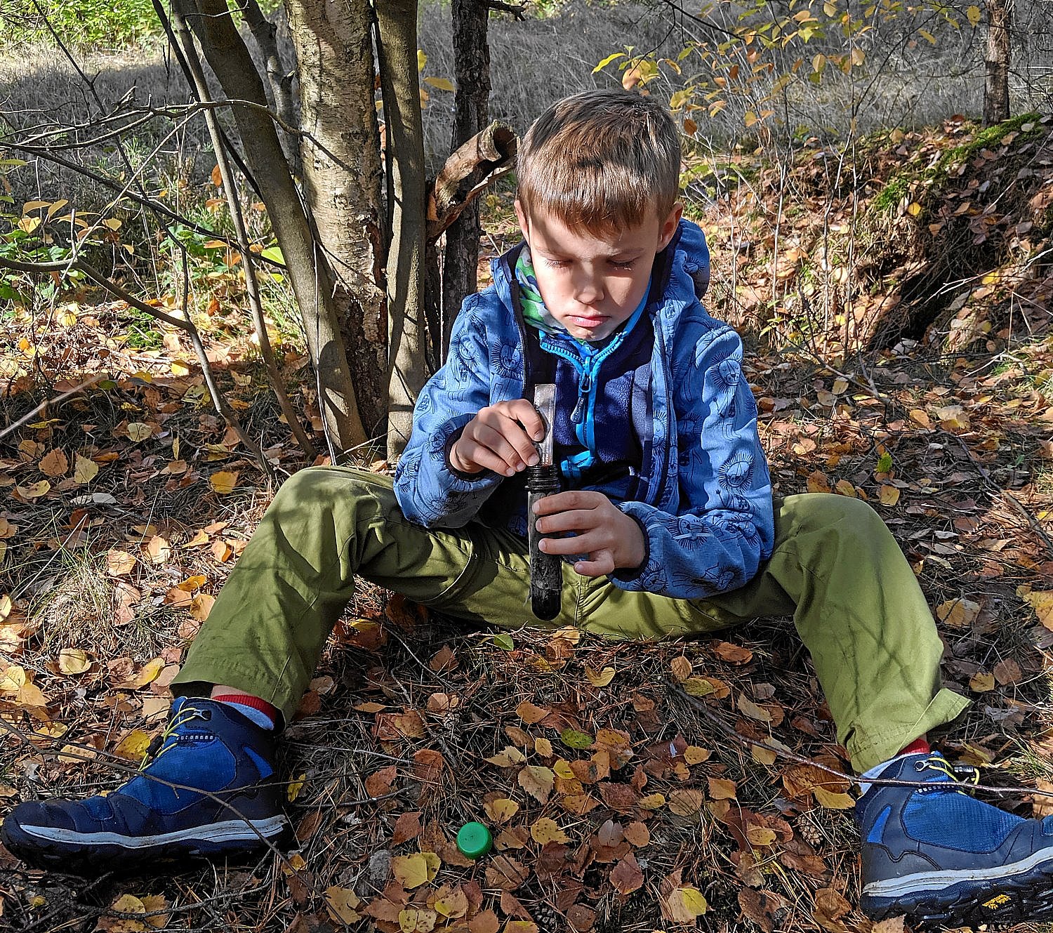 Unser erster Cache, ganz zufällig, da wir gerade im Wald waren. Tomte hat das Handy in die Hand bekommen und wir sind über einen Kilometer geradeaus gegangen. Ein Glück, ist es bei uns flach ...